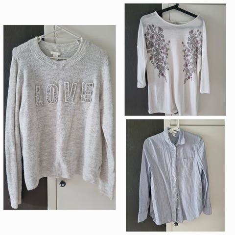 Ett sett med topp og bukse - brukt i juleselskap. Og en genser som er brukt litt til hverdags.