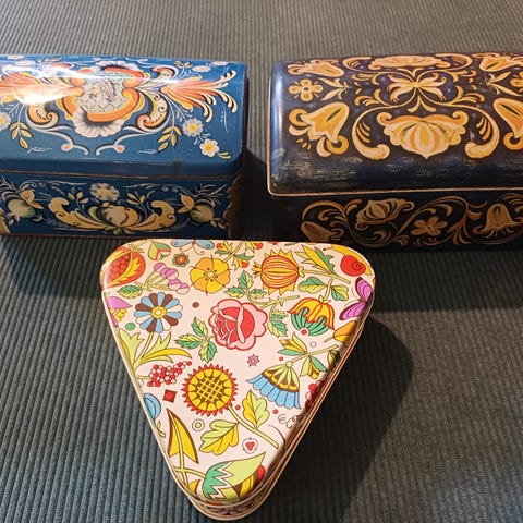 2 sjokolade bokser, Freia Paradis drops-konfekt-blanding og Kiellands sweet-heart assorted candy. 2 ansjosbokser, Fredriksstad Preserving Co AS jule-ansjos og Soon Hermetikfabrik AS Gilde-ansjos. Varierende slitasje, noe rust, alle er tomme og med lokk. Kan sendes (ikke fiks ferdig). Kr.400,- for alle pluss eventuell porto kr 69.