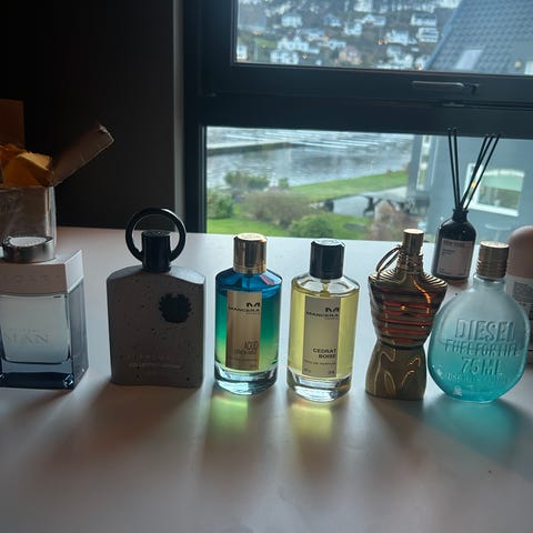 parfyme, assortert utvalg med ulike dufter og flaskestørrelser.