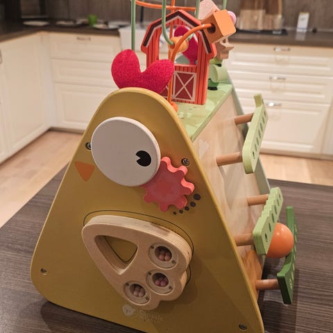 Kan brukes både til gåtrening eller lek/aktivitet for baby. Klosser og spillpinne følger med.