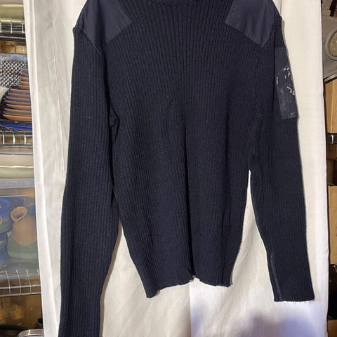 Genser i blå ull, størrelse 3XL. Genseren har forsterkede partier på skuldre og albuer, og er laget i ribbestrikket materiale. Marineblå. 100 % ull. Stilen er «Commando sweater» ribbestrikket mønster og er designet med albue- og skulderbeskyttelse.