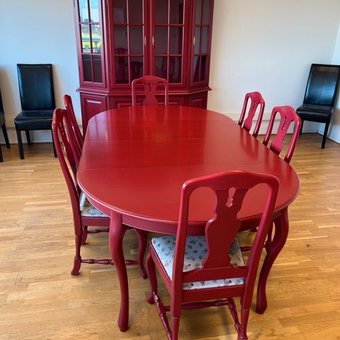 Pent brukt spisebord gruppe med 6 stoler. Noen bruksmerker på stoler og bord. Eller i god stand. Bord er 130 cm diameter. Ingen ileggelse plater. Må hentes i Moss