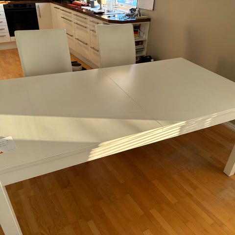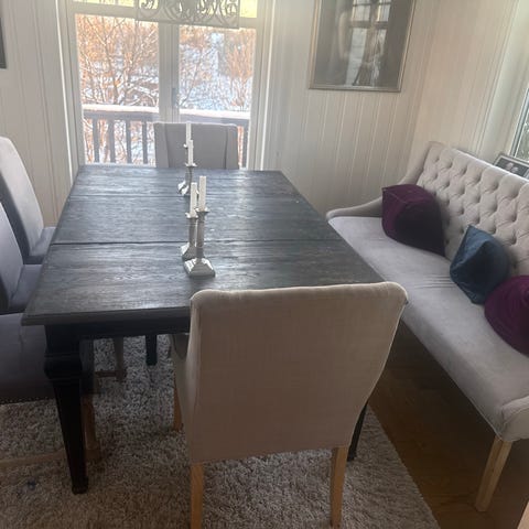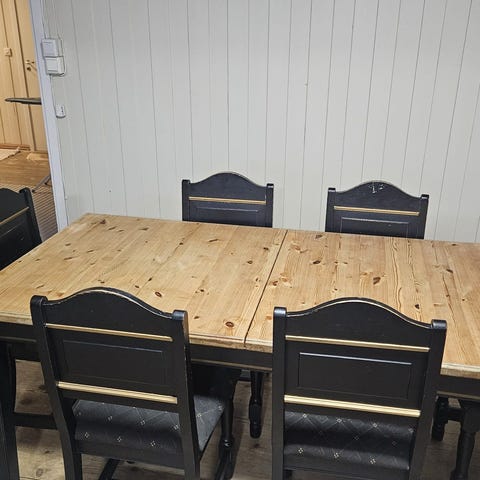 Spisestue med plass til ti. I tre. Må hentes i Rælingen. Ben på bordet er tatt av for lettere frakt.