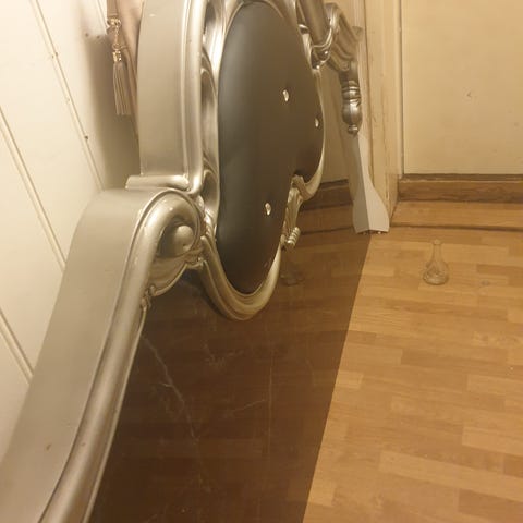 Pent brukt sengegavl med skuffer som kan trekkes ut. Fungerer som nattbord.
