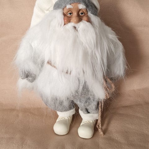 Hvit sittende julenisse med bena hengende utenfor kanten selges. Ca høyde med bein 45 cm. Må hentes, sender ikke.