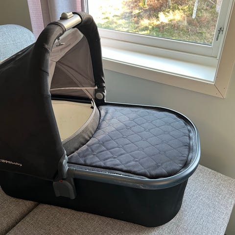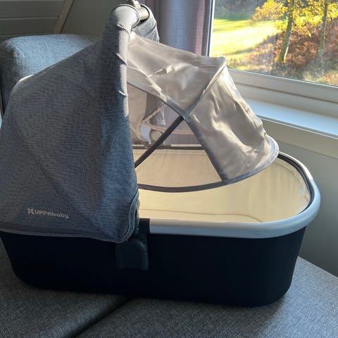 Praktisk og kompakt reisebag til UPPAbaby VISTA barnevogn, med hjul. Som bildene viser er det en liten slitasje på hver side av baksiden, og at sømmen hadde gått litt opp nede, dette kan fint sys sammen for hånd. Ellers i fin stand og fortsatt mye bruk i denne!
