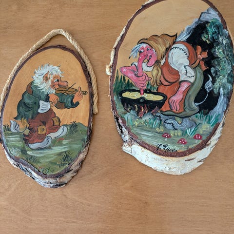Gammelt treplate med et trykt motiv på forsiden, av ukjent opprinnelse. Platen har slitt overflate og viser tegn på alder og bruk. Den er utstyrt med en metallkrok og støtte på baksiden for oppheng. Passer til dekorasjon eller samling.