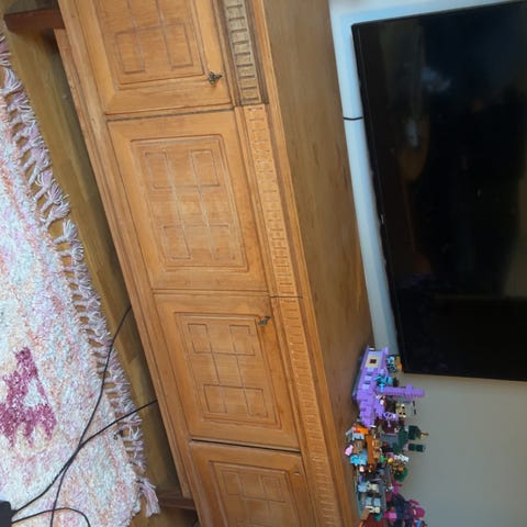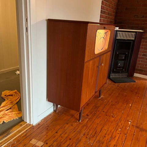Flott skjenk. Kjøpt i Malaysia for 25 år siden. Fire dører. Hyller innvendig. Mulighet for å trekke inn ledninger for stereo/TV utstyr, e.l.
