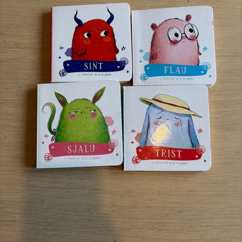 En barnebok som tar for seg ulike følelser på en enkel og gjenkjennelig måte. Gjennom korte historier og spørsmål får barna møte karakterer som opplever glede, sinne, tristhet, redsel og mer. Boken egner seg godt til samtaler mellom barn og voksne, både hjemme og i barnehagen.