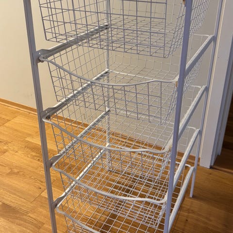 4 stativ med 3 trådkurver i hvert. Solid Elfa kvalitet, som ser ut som nye. Hentes på Frysja