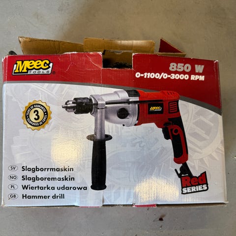 Meec Tools Slagbormaskin med effekt på 500 W, hastighet på 0-2900 rpm og borekapasitet på 13 mm. Egnet for ulike boreoppgaver som krever slagfunksjon. Aldri brukt.