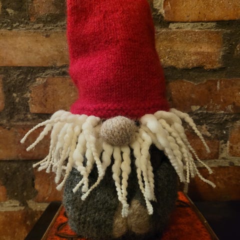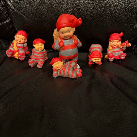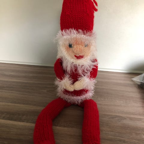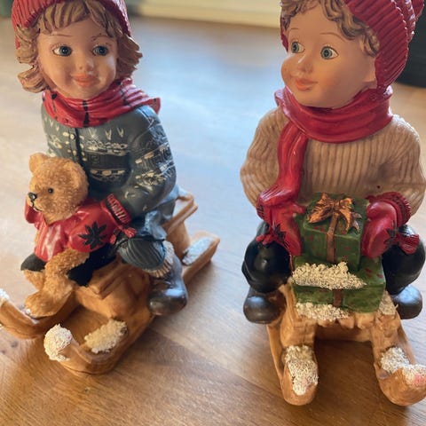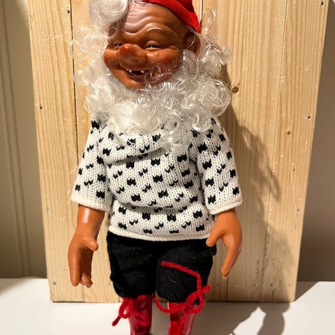 2 nissebarn i strikkede genser og luer selges. Ca høyde 30 cm. Har blitt påskrevet i bunnen. Må hentes, sender ikke.
