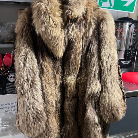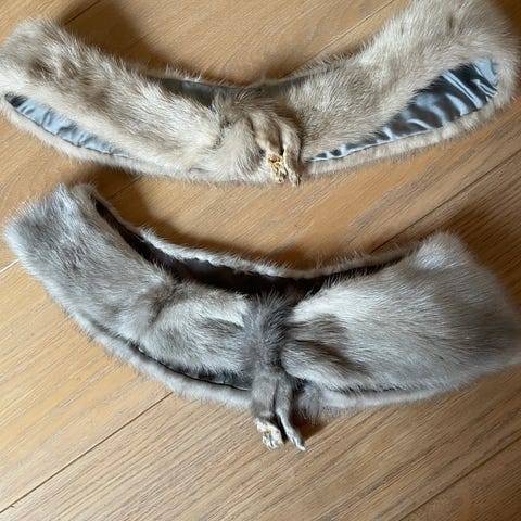 Mørkebrune er sannsynligvis mink, 35cm bred og 2m lang med 2 lommer og frynser. Lik på begge sier minus lommer