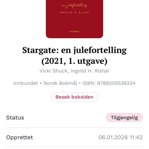 Stargate av Ingvild H.Rishøi. Filmatisert og går på kino nå. Boken har rød innbinding og gullfarget tekst og dekor på omslaget. Boken har en fast rygg. Pent brukt. Lest en gang. Nypris 199,-