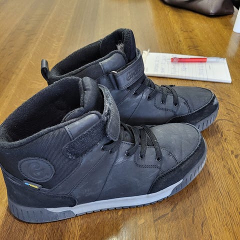 Jeg har klemt sammen hektene slik at man ikke hekter seg fast i noe når man løper. Gode sko til en mild vinter!