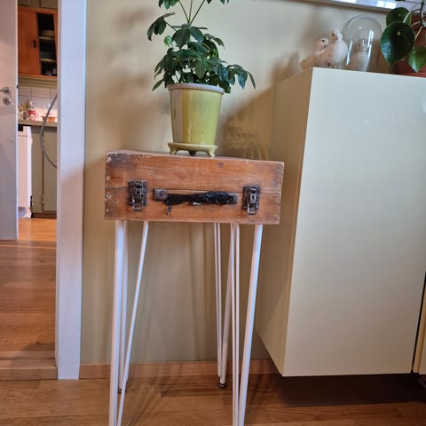 Denne gamle kofferten kjøpte jeg på marked i London. Den har fått bein fra ikea og er veldig fin som lite avlastningsbord. Kan åpnes. Jeg har hjulene til beina som kan settes på da kan bordet trilles lett og det er bremser på beina. Sender ikke, må hentes.