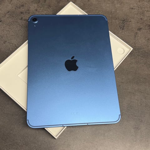 Apple iPad 128 GB nettbrett i blå farge. Enheten har 128 GB lagringskapasitet og kommer med et beskyttende deksel i svart. Passer for generell bruk som surfing, underholdning og produktivitet.