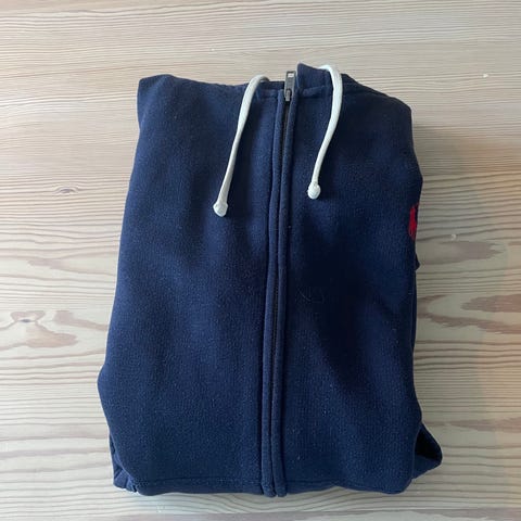 Ralph Lauren hettejakke i størrelse M, farge grå. Laget av bomullsmateriale. Jakken har glidelås og hette, med den karakteristiske Ralph Lauren-logoen brodert på brystet.