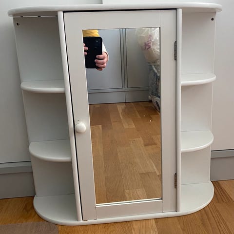 Baderomsmøbel i hvit utførelse med innebygd servant og speilskap. Møbelet har flere skapdører og hyller for oppbevaring. Passer til baderom og gir funksjonell oppbevaringsplass.