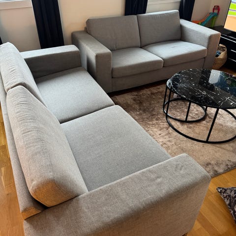 Armlenene kan kanskje trenge en liten vask med en fuktig klut og litt såpe. Sofaen har meget god sittekomfort. Bena er i sort tre.