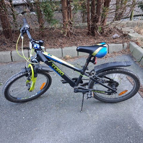 Sykkel med 20 tommer hjulstørrelse. Sykkelen har svart ramme med lilla og blå detaljer, hvitt sete og turkise dekk. Egnet for barn og ungdom.