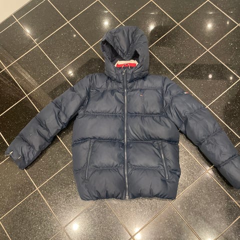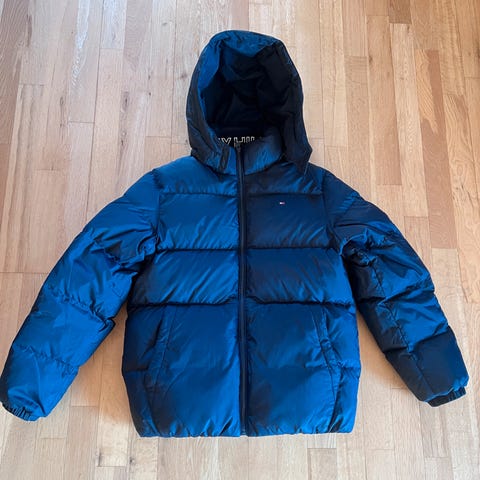 Fin og varm dunjakke fra Tommy Hilfiger. Brukt kun én vinter, men har fått en liten rift nederst på baksiden av høyre arm og en liten flekk, også på baksiden som er lite synlig, ny pris kr 2100.