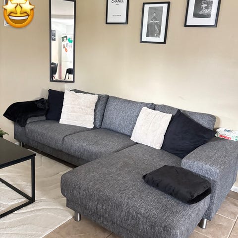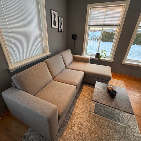 sofa, hjørnesofa, velour, IKEA, mørk sofa, lounge, stue, pent brukt, flyttesalg
