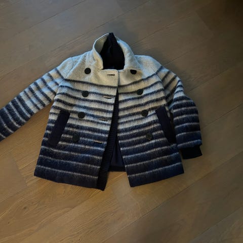 Lindex Annet yttertøy Ulljakke i størrelse S for kvinner. Jakken har flerfarget stripemønster i typisk JP Gaultier stil - hvit og marineblå. Ullblanding og for. Strikkede mansjetter og behagelig strikket sjalskrage. Solide tøffe knapper. Lett innsvinget. Passer som yttertøy for kjøligere vær.