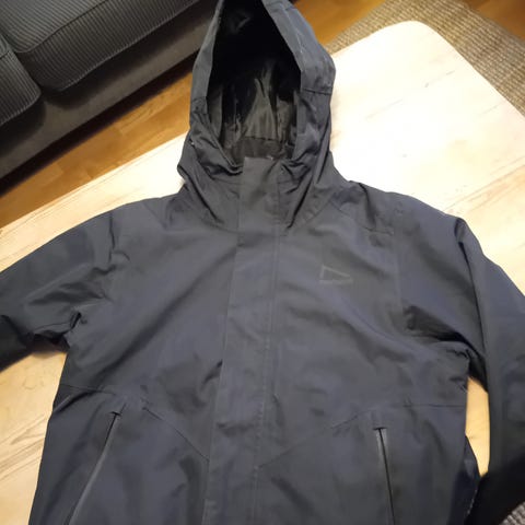 Hovedglidelåsen mangler hempe men en ny en kan lett festes på. Noe skrift på framsiden av jakken. Ikke veldig synlig når den brukes.
