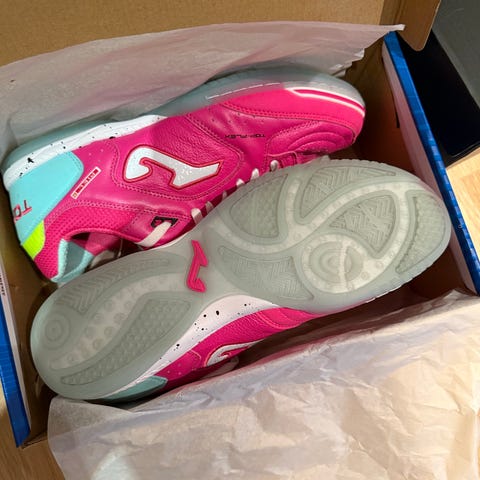 Puma Clyde Hardwood basketballsko med flerfarget design. Skoene har en kombinasjon av blå, rød, oransje og regnbuefargede detaljer. Yttersålen er blå med mønster for grep. Skoene er lite brukt da ungdommen i hus vokser fort ut av dem. Se mine andre annonser. Kan sendes mot at kjøper betaler frakt.