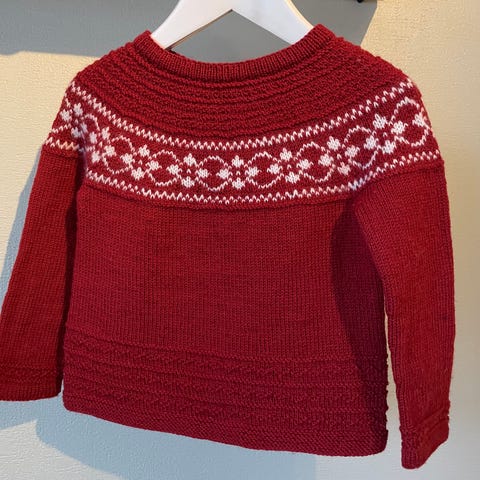 Selger nydelig hjemmestrikket julekjole. Kun brukt én gang. Mønster er Helle tunika fra Strikkmekka. Litt usikker på hvilken størrelse den er strikket i, tipper ca 122/5-6 år. Kjolen måler ca 59cm fra hals til bunn. Overvidde ca 68cm.