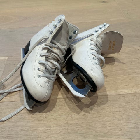 Danseskøyter i størrelse 34 for barn. Liten rift bak på den ene skøyten, Pent brukt.