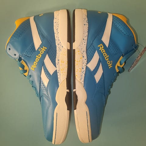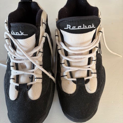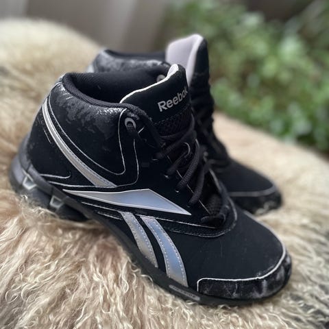 Reebok basketballsko i størrelse 36. Skoene er hvite med detaljer i svart og rødt. Strikklisser.