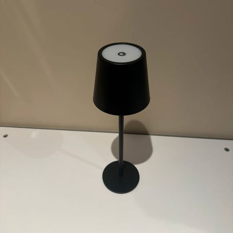 Stilren utendørslampe med stamme i børstet rustfritt stål og opalfarget plast.
