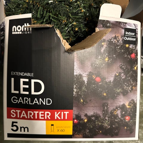 Tykk og robust julelenke / granlenke / julepynt med kongler og praktiske festeordninger. Det er tre stykk på ca 3 meter hver - totalt 9 meter. Den ene lenken er det kappet i to deler på ca 1 meter og 2 meter. Må hentes
