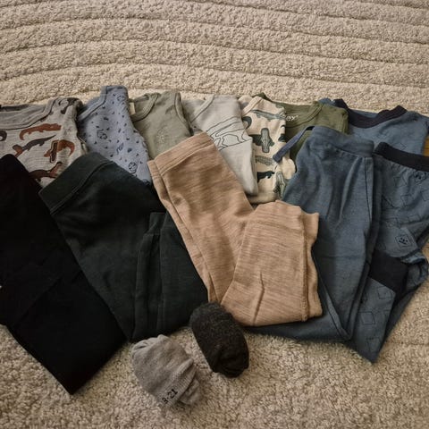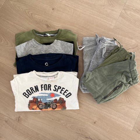 Ei bukse er slitt pa 1 lags av 2 men ikke hull og kan evt ta bort lappen og bruke fra andre sida som er pen (de ser til dobbelt sida brukes)🤪 resten er fint, med minimal flekk på enkelte plagg