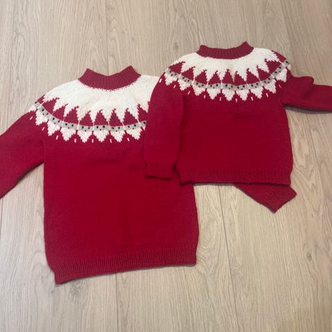Nydelig hjemmestrikket julegenser og nisselue. Svært lite og pent brukt. Strikket i alpakka. Litt usikker på størrelse, tipper ca 122/5-6 år. Selges samlet.