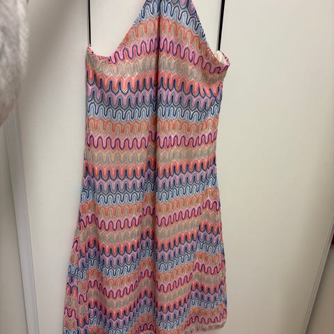 H&M sommerkjole i chiffon materiale, flerfarget mønster. Føles veldig lett på. Noe hvitere i virkeligheten enn hva bildet viser.