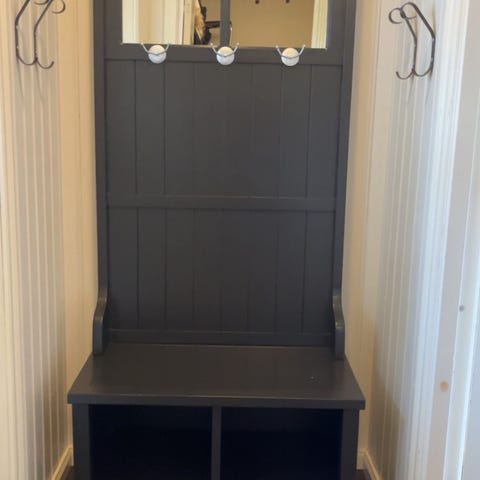 Entremøbel fra Jysk med seks kurver og sittebenk. Avtagbart trekk innvendig i kurver. Pent brukt, men kan trenge etterstramming av skruer i sittebenken. Må hentes i Bjørkebekk, Aremark.