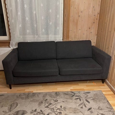 Lys grå i god stand. Et lysere område på det ene armlenet etter rens fra kaffe ble sølt. Kan kanskje jevnes ut hvis hele armlenet renses. Ellers er resten av sofaen i god stand. Putene i fin stand og nyvasket.