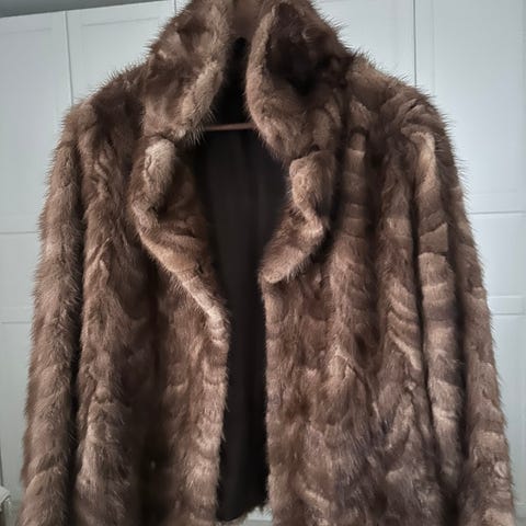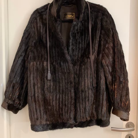 Nydelig mink-jakke i brunt, med klassisk snitt og med oppbrettbar krage, selges. Brunt silkefor innvendig. Pent brukt. Ingen skader.