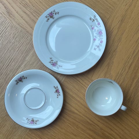 Kaffeservise som stod i campingvogna vår da vi overtok den gis bort.