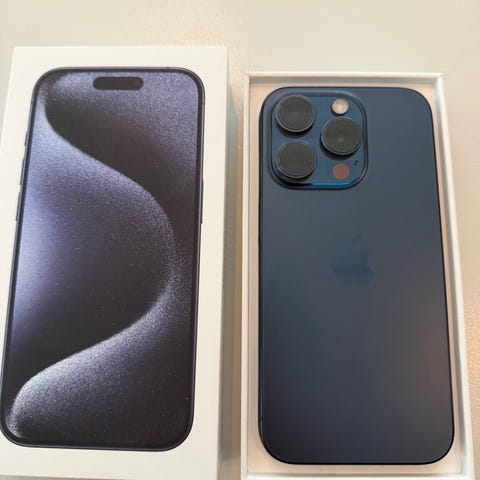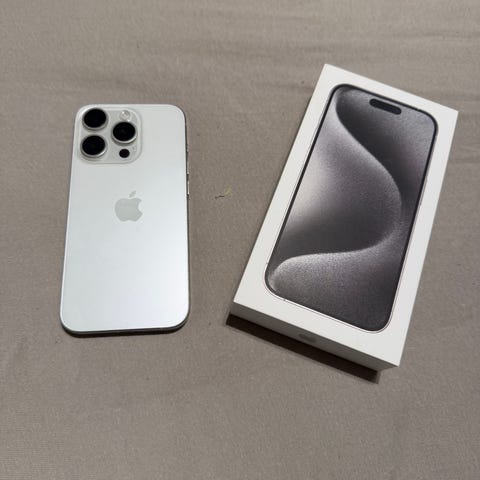 Svart/sort Apple iPhone 15 Pro mobiltelefon med 128 GB lagringskapasitet selges etter overgang til jobbtelefon.