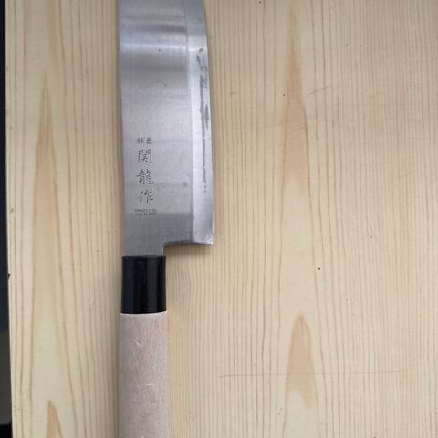 Solid japansk kokkekniv i VG10 stål med en nydelig damask. Kniven har noen riper og merker etter sliping. Litt TLC burde ta hånd om det.
