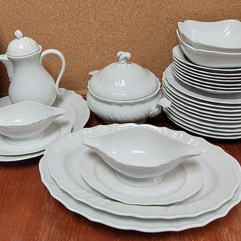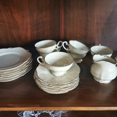 Servise inkluderer 7kopper, 14 tallerkener og 9 tefat. 2 av koppene har små hakk