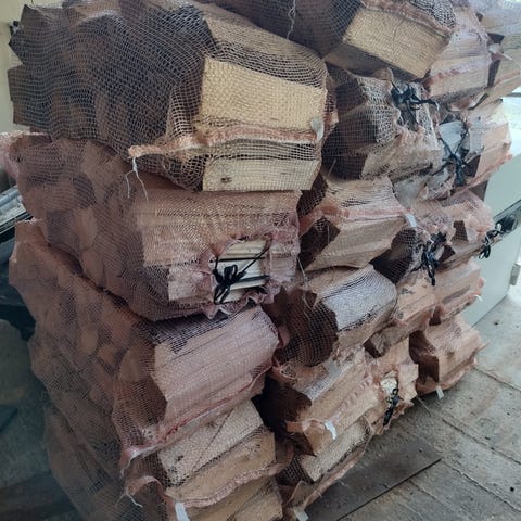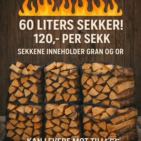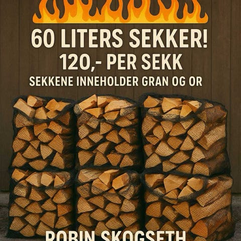Fjorårets ved selges rimelig, kr 50, per 60 liter sekk