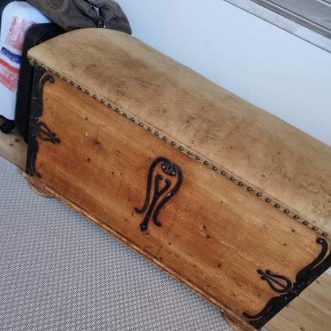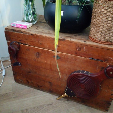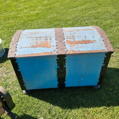 En vakker kiste med ukjent treverk. Har søkt på kisten, og andre mener det er teak, ikke helt enig men det, men usikker. Vi har ikke plass til den og håper den finner et nytt hjem.