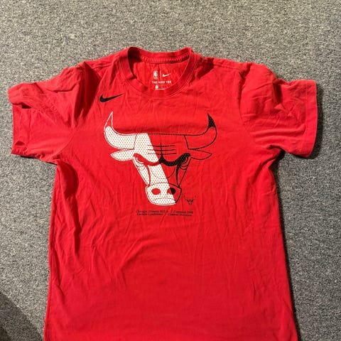 Nike Chicago Bulls T-skjorte i bomull, størrelse S, hvit farge, designet for herre. T-skjorten har flere trykk med Chicago Bulls-logo og Nike-swoosh. Kjøpt på JD sport. Nesten ikke brukt. Tilsvare som ny.