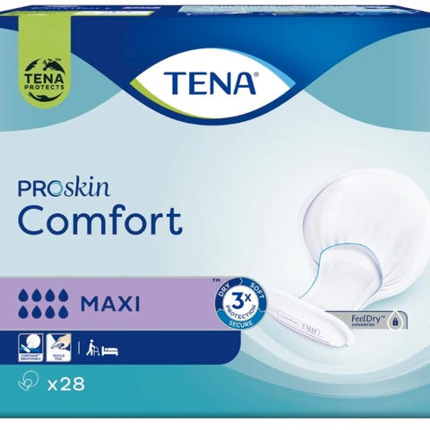 Tena Men absorpsjonsprodukter i mørk blå farge, designet for menn. Pakken inneholder flere enheter med ulike typer absorpsjonsprodukter for personlig pleie og hygiene.