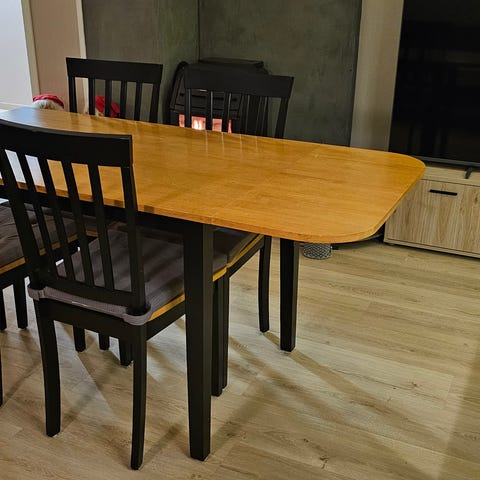 God brukt kjøkkenbord med side plate, bredde 120cm med side plate oppe. Noen bobler på bordflaten, se bilder. Og litt slitasje se bilder.